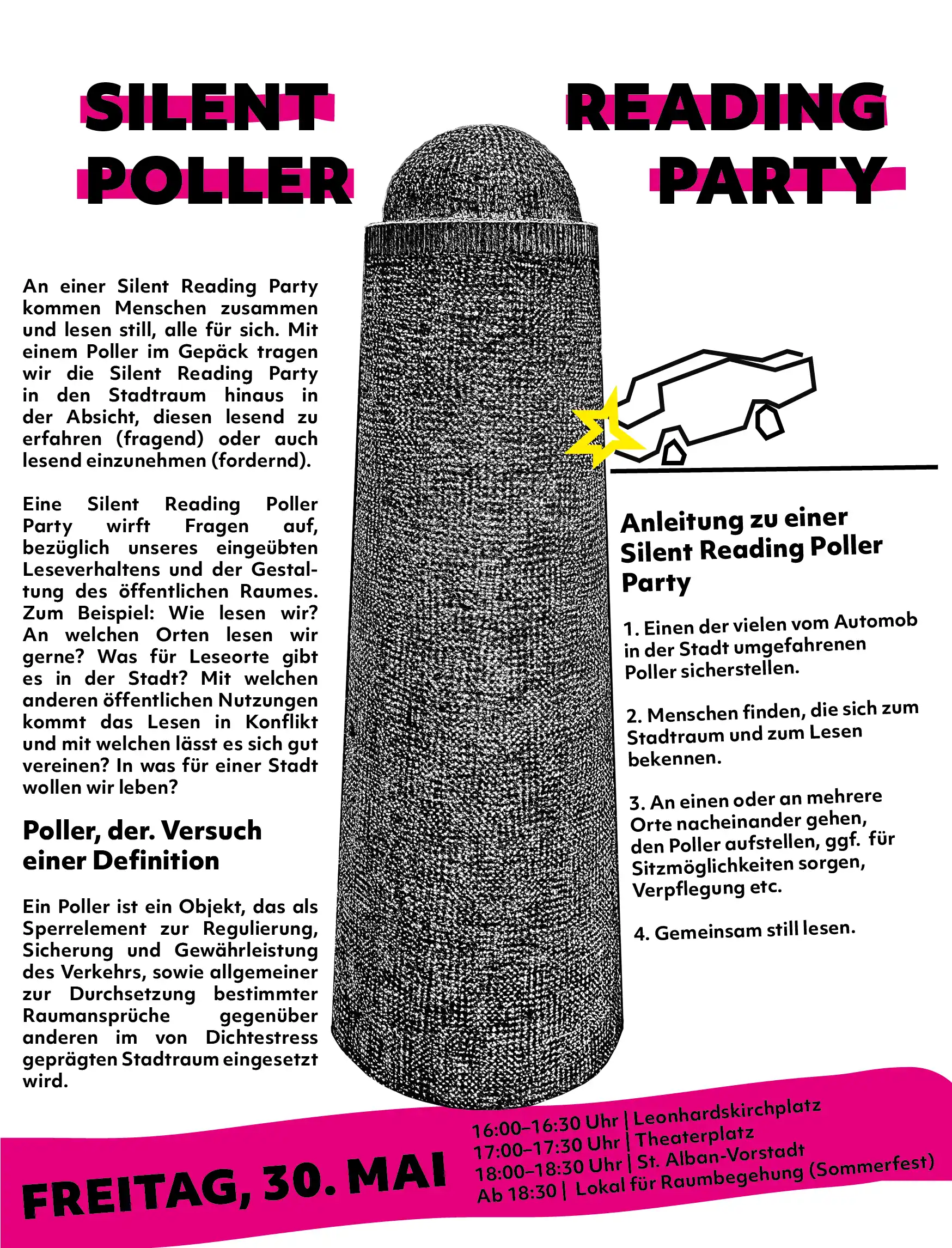 Auch an einer Silent Reading Poller Party kommen Menschen zusammen, um gemeinsam still zu lesen, alle für sich, alle mit ihrer je eigenen Lektüre... Der Unterschied – oder: die Variation – liegt darin, dass das kollektive Lese-Event mit der Absicht in den öffentlichen Raum hinausgetragen wird, den Stadtraum lesend zu erfahren (fragend) oder auch lesend einzunehmen (fordernd). Mit dem Buch in der Hand wird die Wahrnehmung des Stadtraums verfremdet und auch auf bestimmte Bedürfnisse hin geprüft. Es ist wahrscheinlich, dass es an Sitzgelegenheiten fehlt. Starker (störender?) Verkehr ist möglich. Eine Silent Reading Poller Party wirft Fragen auf, bezüglich unseres eingeübten Leseverhaltens, bezüglich der Gestaltung des öffentlichen Raumes. Zum Beispiel: Wie lesen wir? An welchen Orten lesen wir gerne? Was für Leseorte gibt es in der Stadt? Mit welchen anderen öffentlichen Nutzungen kommt das Lesen in Konflikt und mit welchen lässt es sich gut vereinen? In was für einer Stadt wollen wir leben?